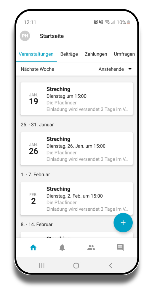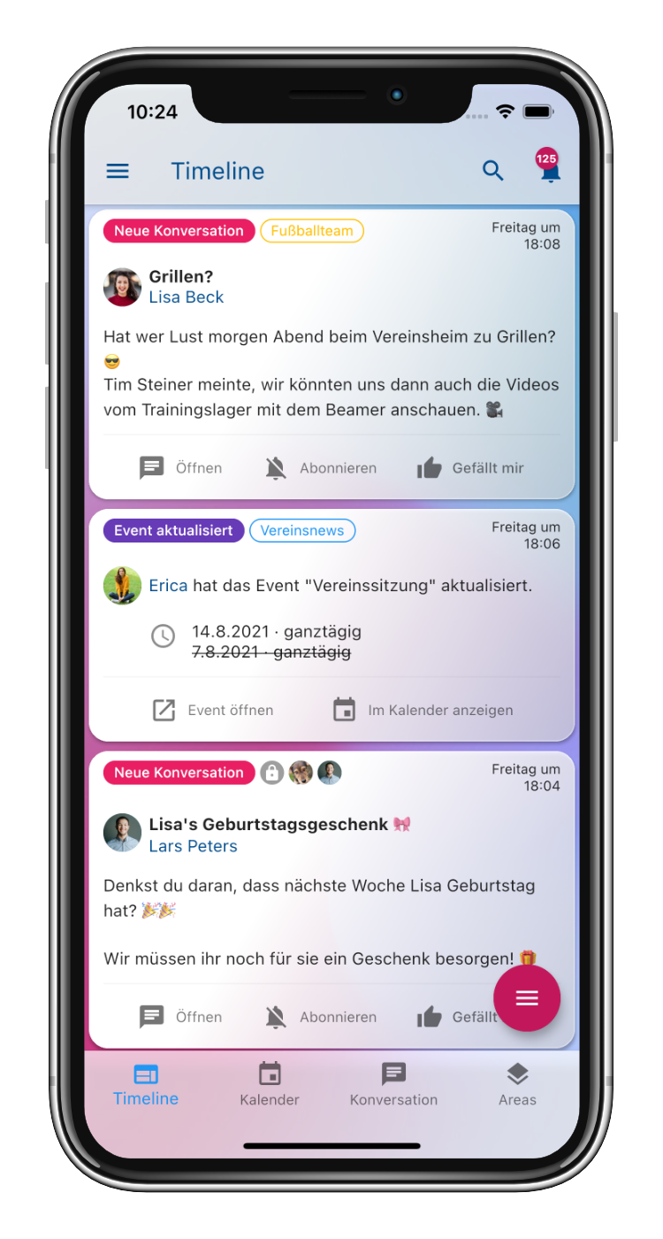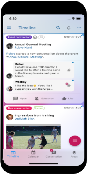 Gleichzeitig wird durch das Abonnieren relevanter Inhalte sichergestellt, dass keine Information mehr durch die Lappen gehen. Zudem gibt es mit der Timeline eine zentrale Newsquelle, mit der eure Mitglieder individuell auf dem Laufenden bleiben können – ähnlich wie man das aus den großen sozialen Medien kennt, nur eben im geschützten Raum eures Vereins.