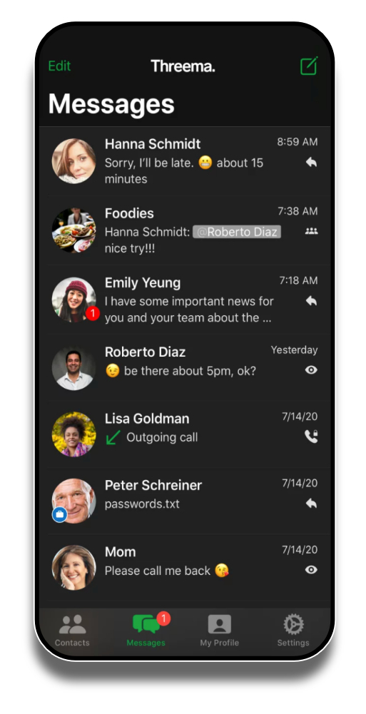 Threema ist ein Schweizer Messager-Dienst zur Nutzung auf Smartphones und Tablets, dessen Fokus ebenfalls auf der Privatsphäre liegt. Die Nachrichten dieser Chatapp sind alle Ende-zu-Ende verschlüsselt. Ihr könnt Threema außerdem auf dem Desktop verwenden. Im Funktionsumfang erinnert auch Threema stark an WhatsApp und Signal.